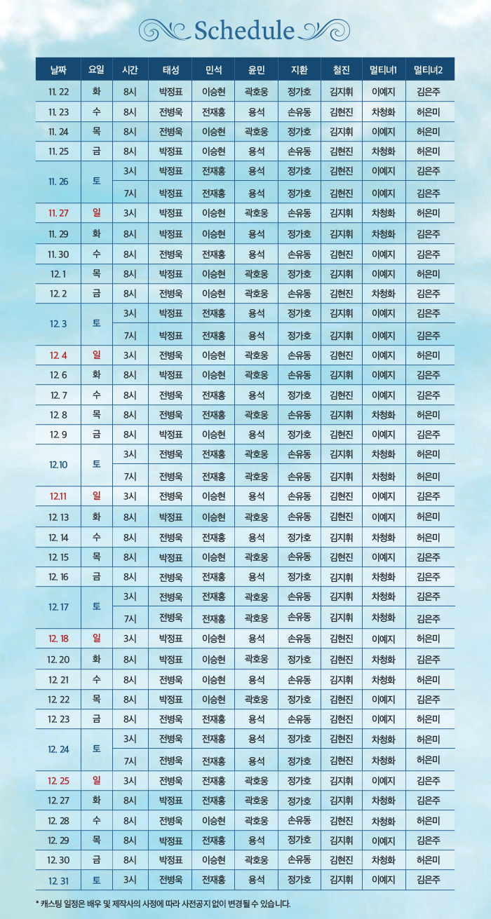 | 공연시간 | 화~금 8시/ 토 3시,7시/ 일3시 (월 공연없음) | ||||||||||||||||||||||||||||||||||||||||||||||||||||||
