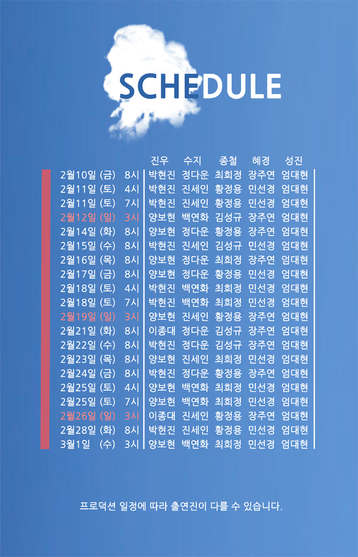 | 공연시간 | 화수목금 8시, 토요일 4시 7시,일요일(공휴일)3시 | ||||||||||||||||||||||||||||||||||||||||||||||||||||||