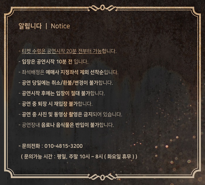 | 공연문의 | 010-4815-3200 (문의시간 참조) | ||||||||||||||||||||||||||||||||||||||||||||||||||||||