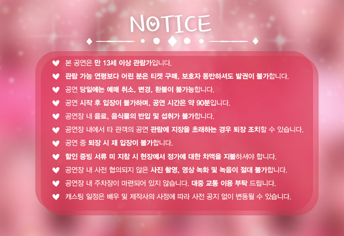 | 공연시간 | 화~금 20:00 / 토, 일 15:00, 18:00 / 월요일 공연 없음 | ||||||||||||||||||||||||||||||||||||||||||||||||||||||