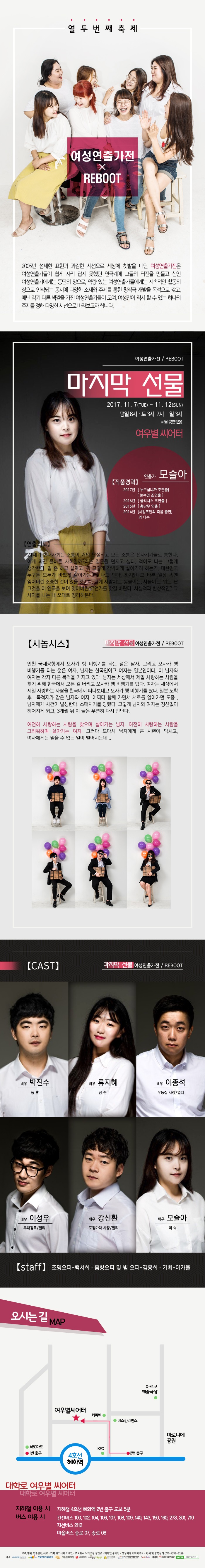 | 공연장소 | 여우별 씨어터(구. 내여페 The Stage) | ||||||||||||||||||||||||||||||||||||||||||||||||||||||