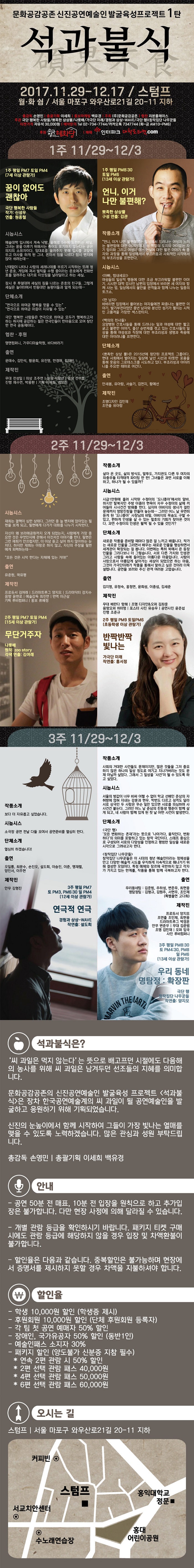 | 할인정보 | 첫 공연 예매자 50%/청소년, 대학생 할인 50%(학생증제시)/공연예술계 종사자 본인에 한하여 50%/장애인할인 50%/예술인패스 15,000원 |
