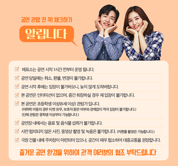 | 공연시간 | 월화수목금 14:00 17:00 20:00 / 토일 13:00 15:10 17:20 19:30 | ||||||||||||||||||||||||||||||||||||||||||||||||||||||