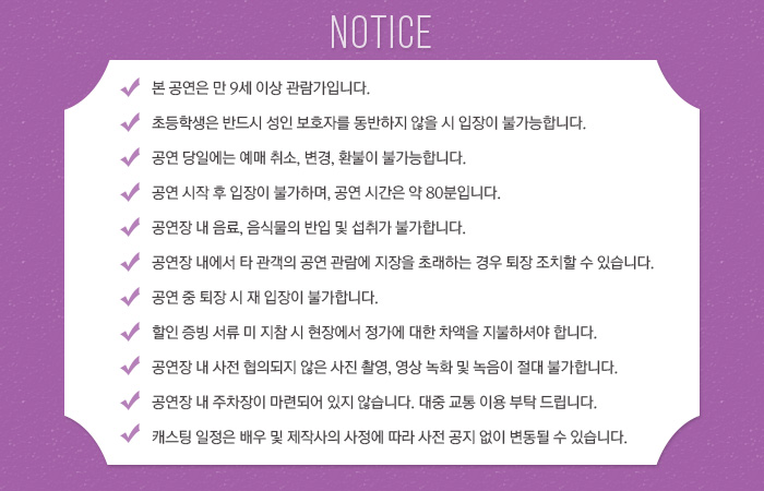 | 공연시간 | 수목금 20:00 / 토 15:00 18:00 / 일 15:00 / 월화 공연 없음 | ||||||||||||||||||||||||||||||||||||||||||||||||||||||