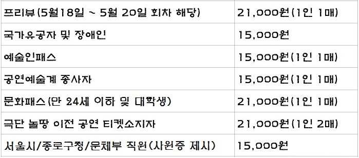 | 공연시간 | 화수목금 20:00 / 토 15:00, 19:00 / 일 15:00 / 월 휴무 | ||||||||||||||||||||||||||||||||||||||||||||||||||||||