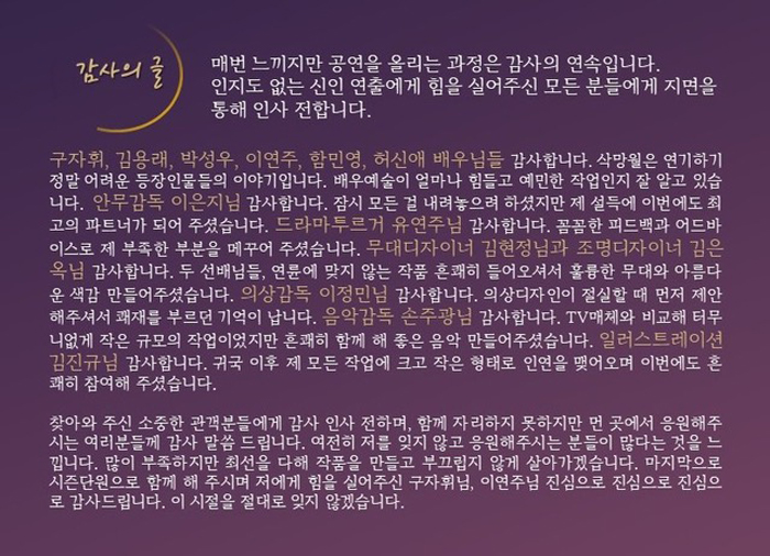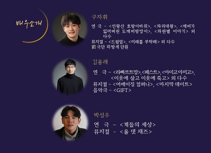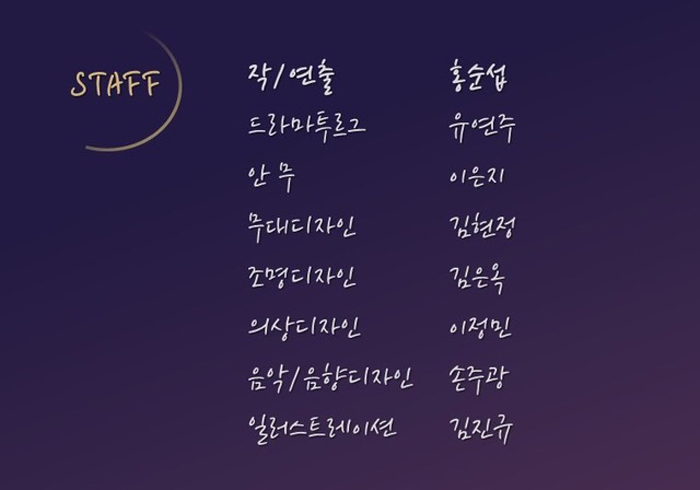 | 공연시간 | 목금 20:00 / 토 15:00, 19:00 / 일 16:00 | ||||||||||||||||||||||||||||||||||||||||||||||||||||||