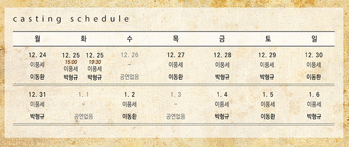 | 공연시간 | 화수금 19:30 / 토일 및 공휴일 16:00 | ||||||||||||||||||||||||||||||||||||||||||||||||||||||
