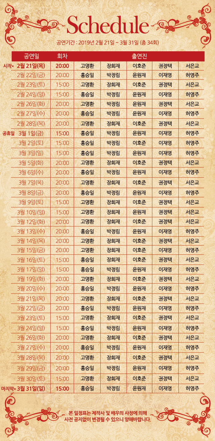 | 공연시간 | 화수목금 20:00 / 토일 15:00 / 월 공연없음 | ||||||||||||||||||||||||||||||||||||||||||||||||||||||