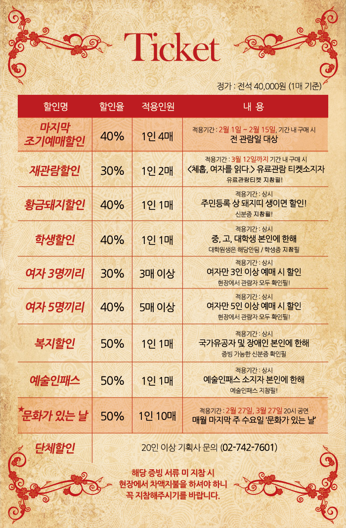 | 공연문의 | 02-742-7601 | ||||||||||||||||||||||||||||||||||||||||||||||||||||||