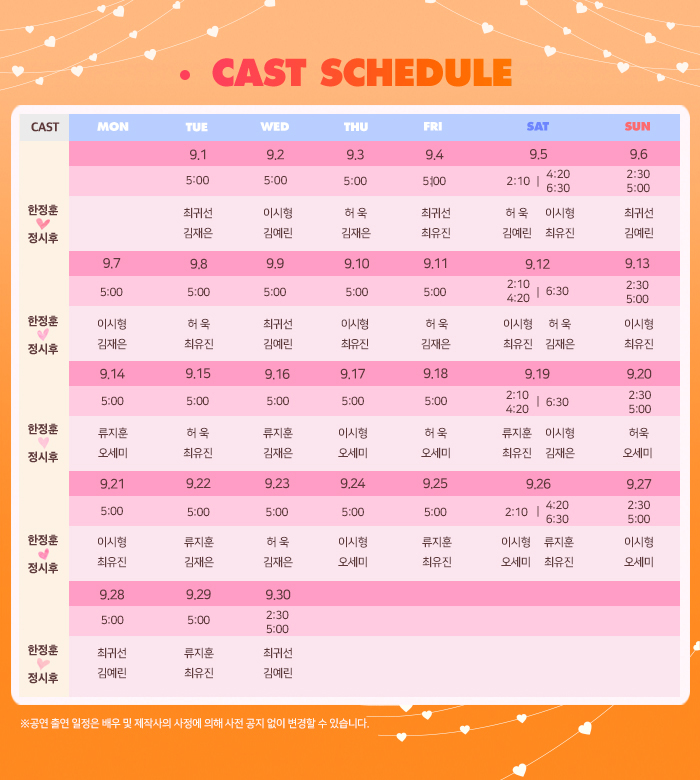 | 공연시간 | 월화수목금 17:00 / 토 14:10 16:20 18:30 / 일 및 공휴일 14:30 17:00 | ||||||||||||||||||||||||||||||||||||||||||||||||||||||