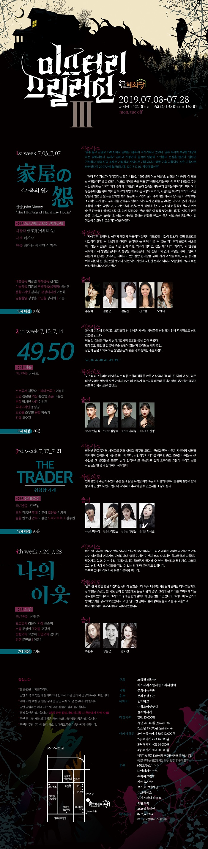 | 제작 | 주최 : 소극장 혜화당, 미스터리스릴러전 조직위원회 | ||||||||||||||||||||||||||||||||||||||||||||||||||||||