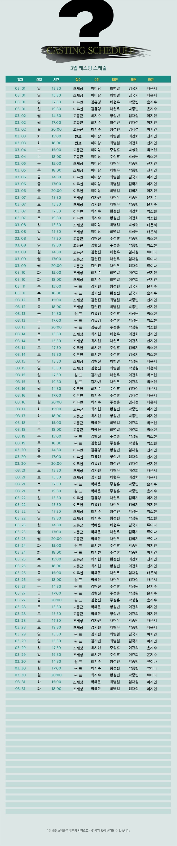 | 공연시간 | 월금 14:30 17:00 20:00 / 화수목 15:00 18:00 / 토일 13:30 15:30 17:30 19:30 | ||||||||||||||||||||||||||||||||||||||||||||||||||||||
