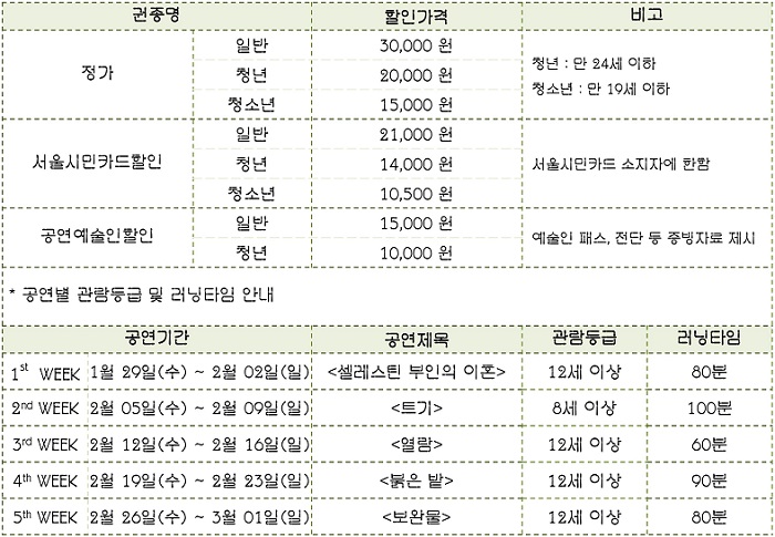 | 티켓가격 | 일반 30,000원 / 청년 20,000원 / 청소년 15,000원 | ||||||||||||||||||||||||||||||||||||||||||||||||||||||