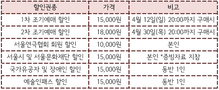 | 공연시간 | 화수목금 20:00 / 토 15:00 19:00 / 일 15:00 / 월 공연 없음 | ||||||||||||||||||||||||||||||||||||||||||||||||||||||