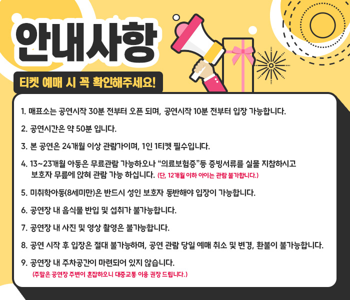 | 공연장르 | 뮤지컬(창작), 뮤지컬(아동극), [테마] 아동, 가족 대상, [추가분류] 오픈런 | ||||||||||||||||||||||||||||||||||||||||||||||||||||||