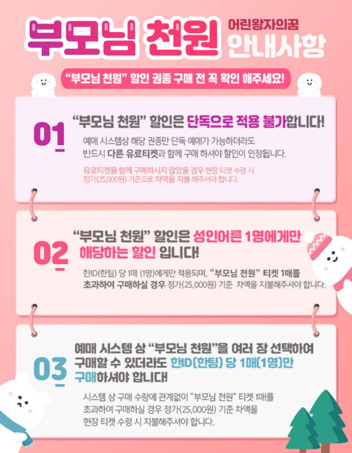** `부모님 천원` 권종은 [아이 + 어른] 묶음 권종으로 1매 구매시 아이1명 + 어른1명