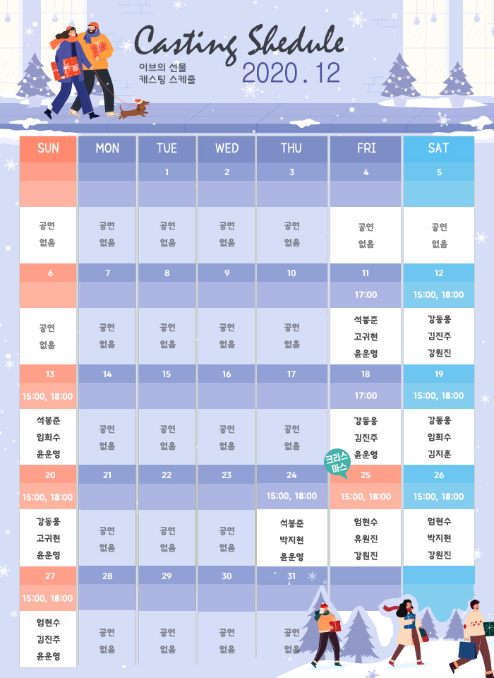 | 공연시간 | 금 17:00 / 토일 15:00 18:00 / 월화수목 공연 없음 | ||||||||||||||||||||||||||||||||||||||||||||||||||||||