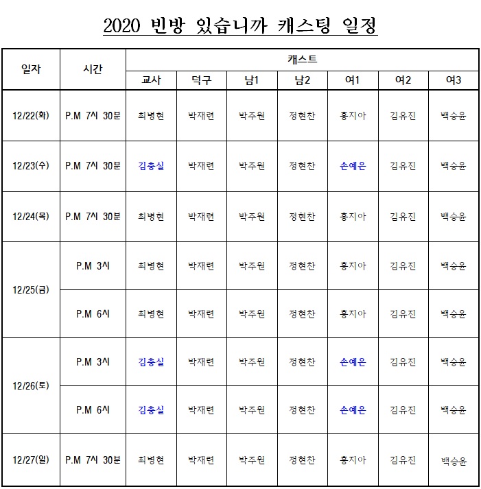 | 공연일자 | 2020-12-22(화) ~ 2020-12-27(일) | ||||||||||||||||||||||||||||||||||||||||||||||||||||||