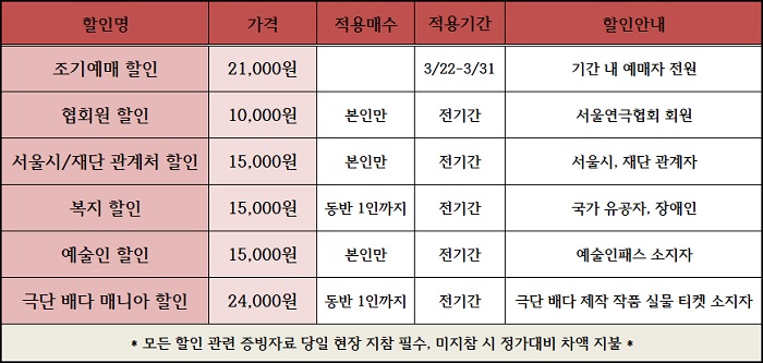 - 본 연극은 공연 시작 후 지연 관객의 추가 입장은 불가합니다.
