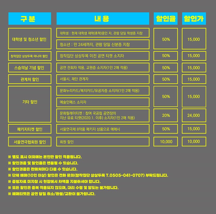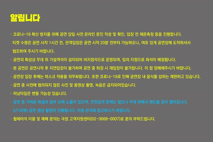 | 공연장소 | 아르코예술극장 대극장 | ||||||||||||||||||||||||||||||||||||||||||||||||||||||