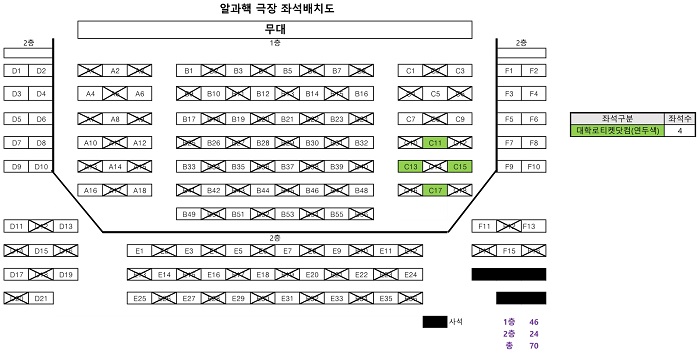 공연 당일 현장에서 아래 좌석배치도에 연두색으로 표시된 좌석 중 지정되오니