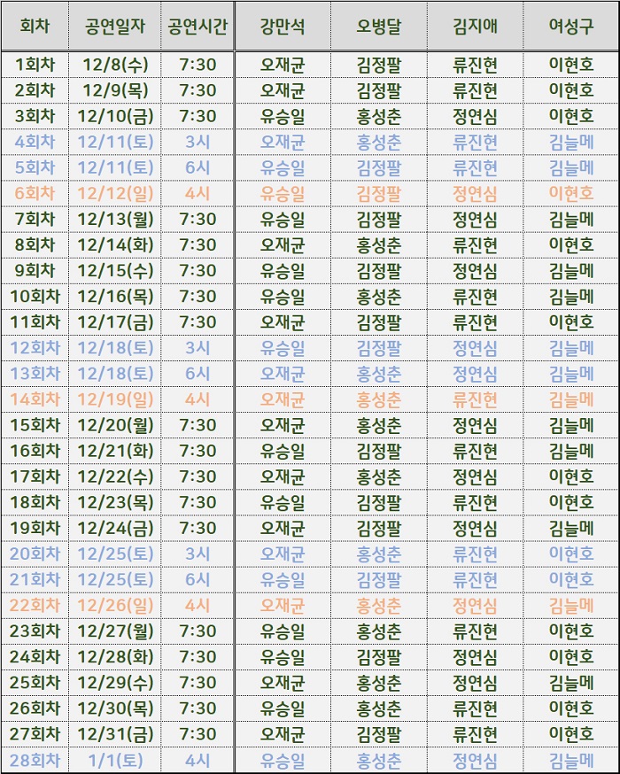 | 공연시간 | 월화수목금 19:30 / 토 15:00 18:00 / 일 16:00 | ||||||||||||||||||||||||||||||||||||||||||||||||||||||