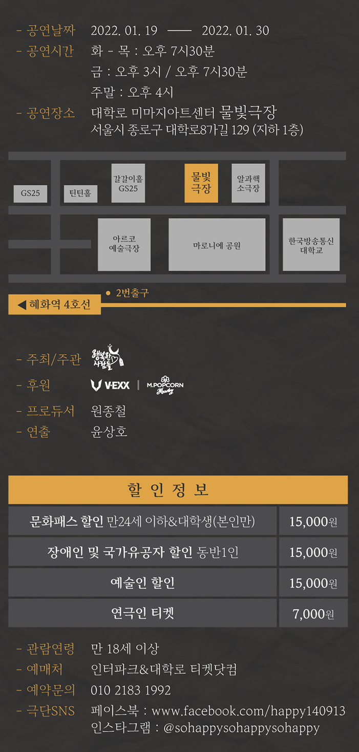 | 공연일자 | 2022-01-19(수) ~ 2022-01-30(일) | ||||||||||||||||||||||||||||||||||||||||||||||||||||||
