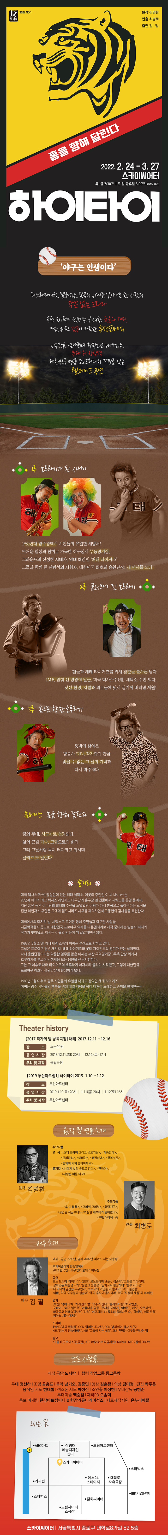 두산아트랩 공연 2019에서 연극 하이타이를 처음 알게 되었어요. 믿고 보는 김명환 작가의 작품으로 김필 배우가 혼자서 하는 1인극 모노극에 게다가 야구를 소재로 만들어 더 기대가 컸어요. 국민 스포츠 야구에 얽힌 이야기는 물론이고 518민중항쟁과 전두환 정권 등 시대상을 반영하여 웃고 울고 감동하게 만드는 작품이었어요. 본 공연에서 다시 한번 더 보고 싶었던 극으로 김필 배우와 함께 대학로로 돌아온다니 이보다 더 좋을 순 없네요. 코로나에 오미크론까지 뒤덮은 요즘 시국에 주위에 들리는 것은 우울한 소식 뿐인데 하이타이 연극, 재미있는 공연을 다시 볼 수 있어 기분이 좋아요. |