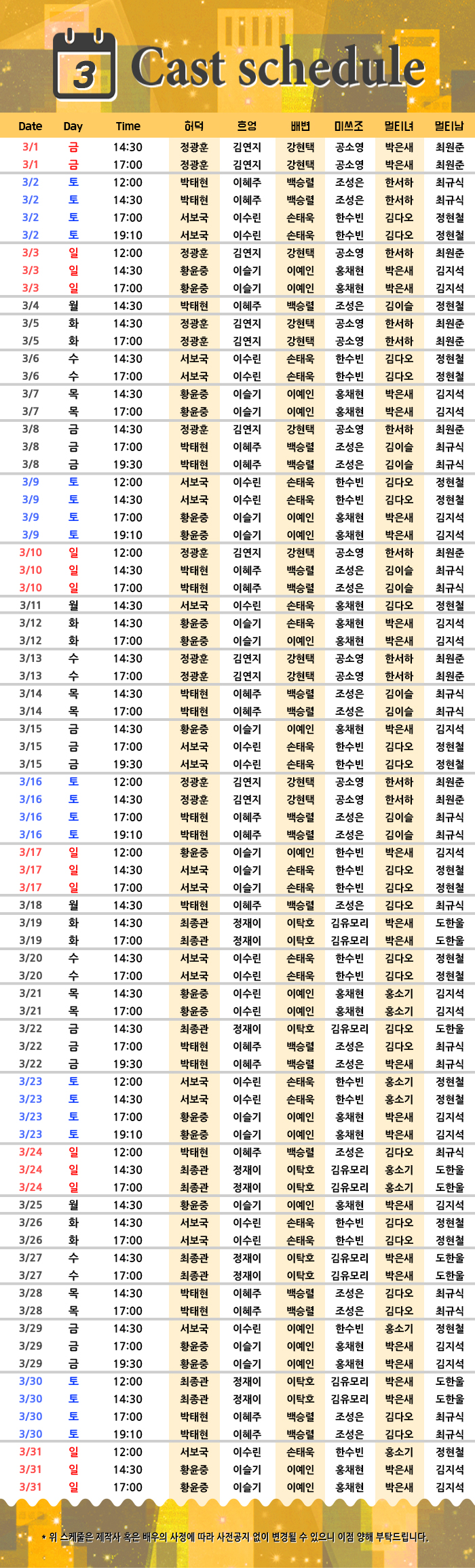 | 공연시간 | 월화수목 14:30 17:00/금 14:30 17:00 19:30/토 12:00 14:30 17:00 19:30/일 13:30 16:00 18:30 | ||||||||||||||||||||||||||||||||||||||||||||||||||||||