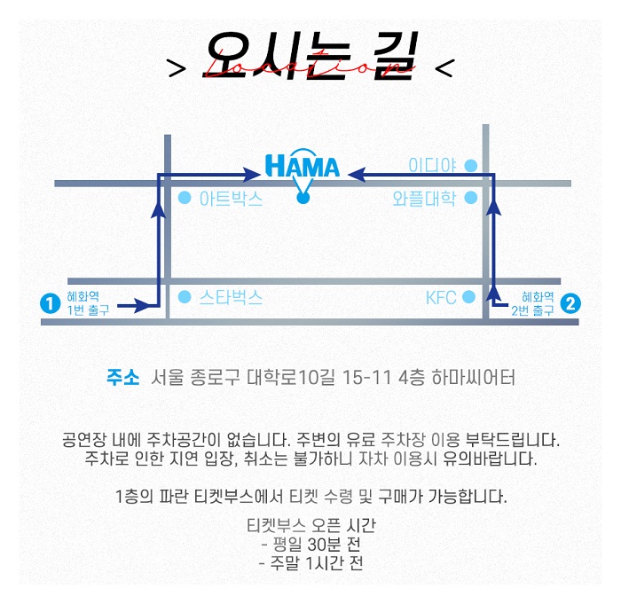 ※공연장 앞 매표소는 공연 시작 평일 30분 전 / 주말 1시간 전에 열립니다.