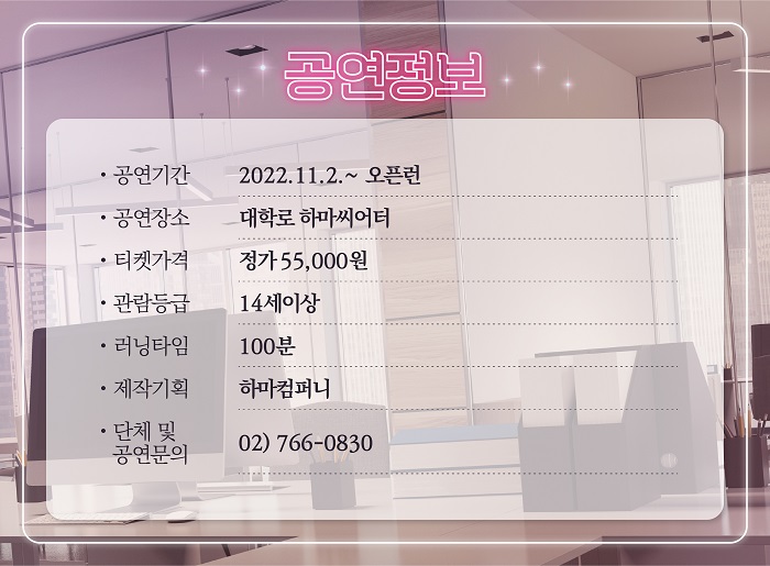 | 공연시간 | 금 19:30 / 토 19:00 / 일 14:00 (월화수목 공연 없음) | ||||||||||||||||||||||||||||||||||||||||||||||||||||||