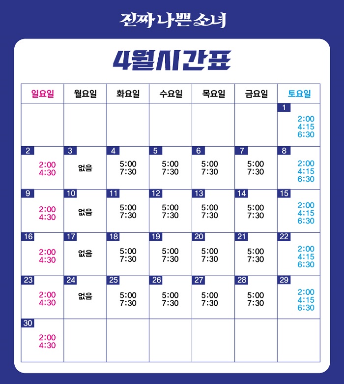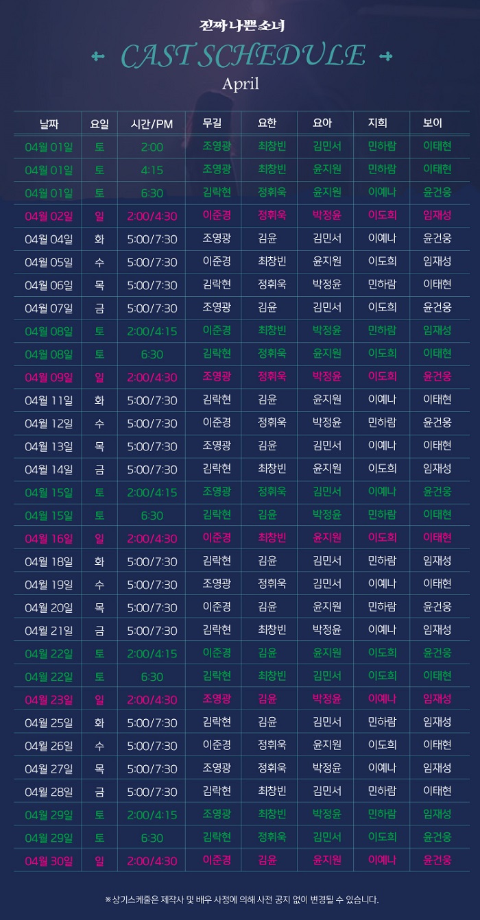 | 공연시간 | 화수목금 17:00 19:30 / 토 14:00 16:15 18:30 / 일,공휴일 14:00 16:30 / 월 공연 없음 | ||||||||||||||||||||||||||||||||||||||||||||||||||||||