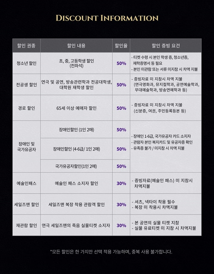 | 공연시간 | 화수목금 19:30 / 토 16:00 19:30 / 일 16:00 / 월 공연 없음 | ||||||||||||||||||||||||||||||||||||||||||||||||||||||
