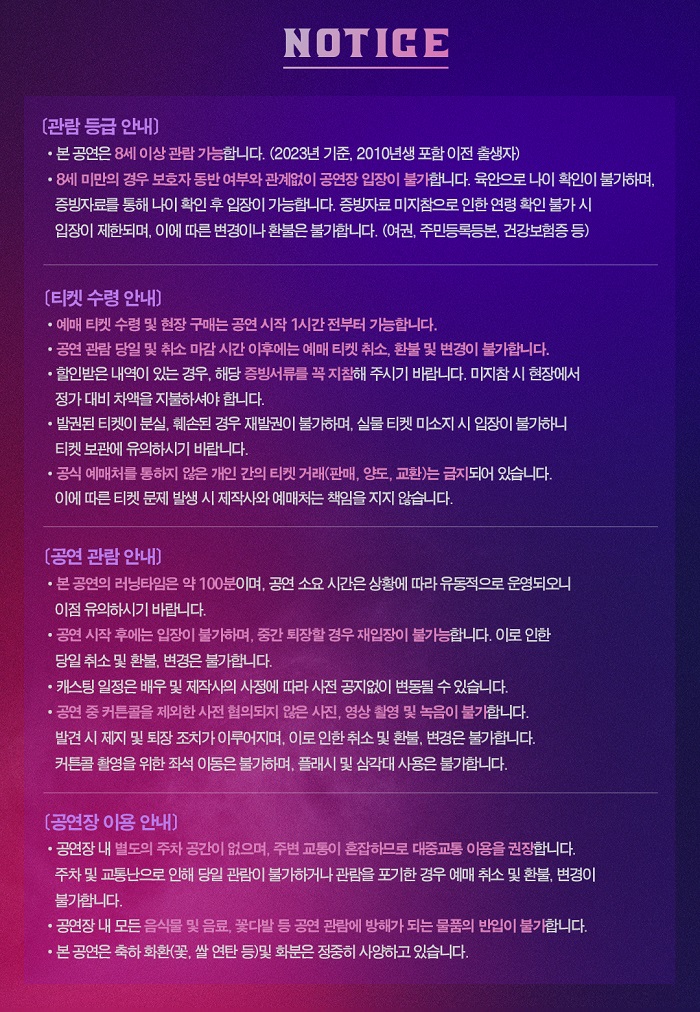 | 공연일자 | 2023-10-13(금) ~ 2023-12-31(일) | ||||||||||||||||||||||||||||||||||||||||||||||||||||||