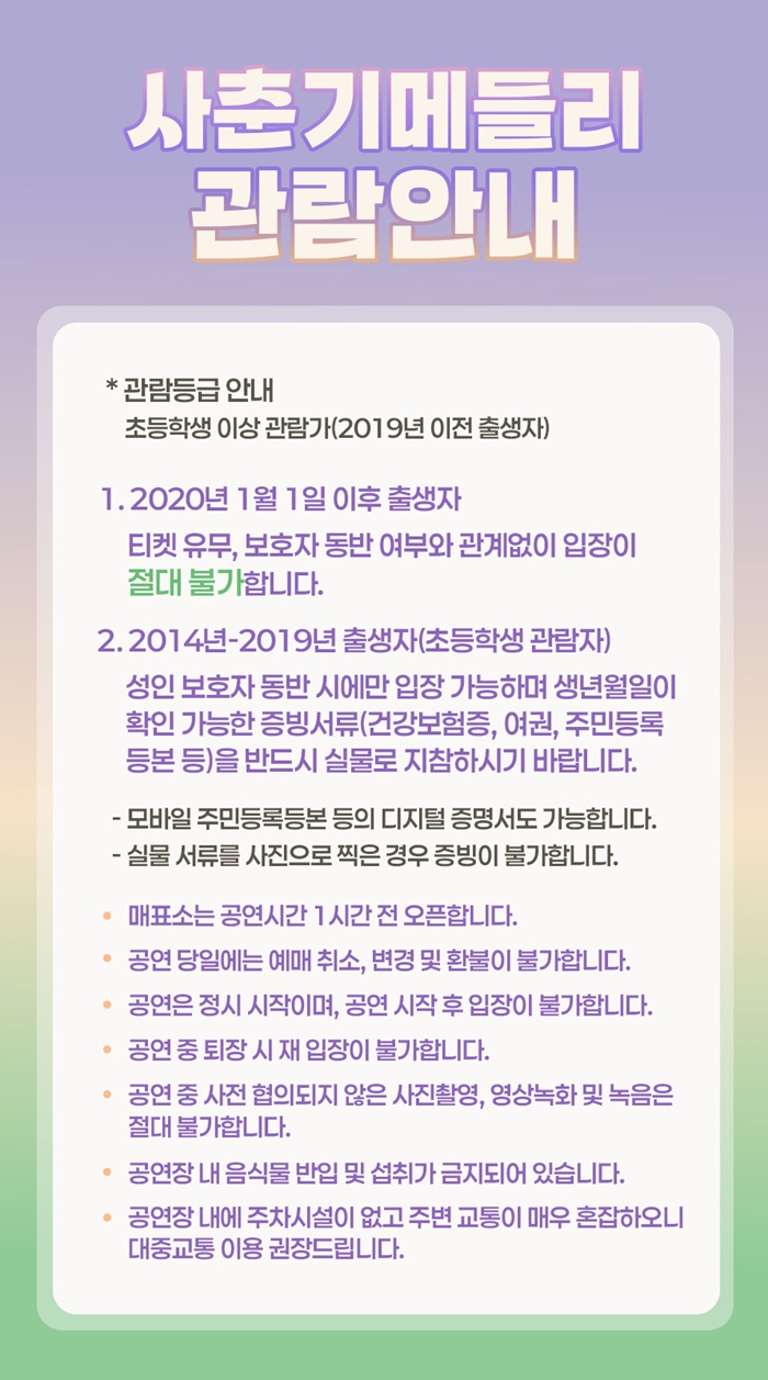 * 만 7세이상 관람가 (초등학생 이상 관람가 / 초등학생은 성인보호자 동반 입장 필수)