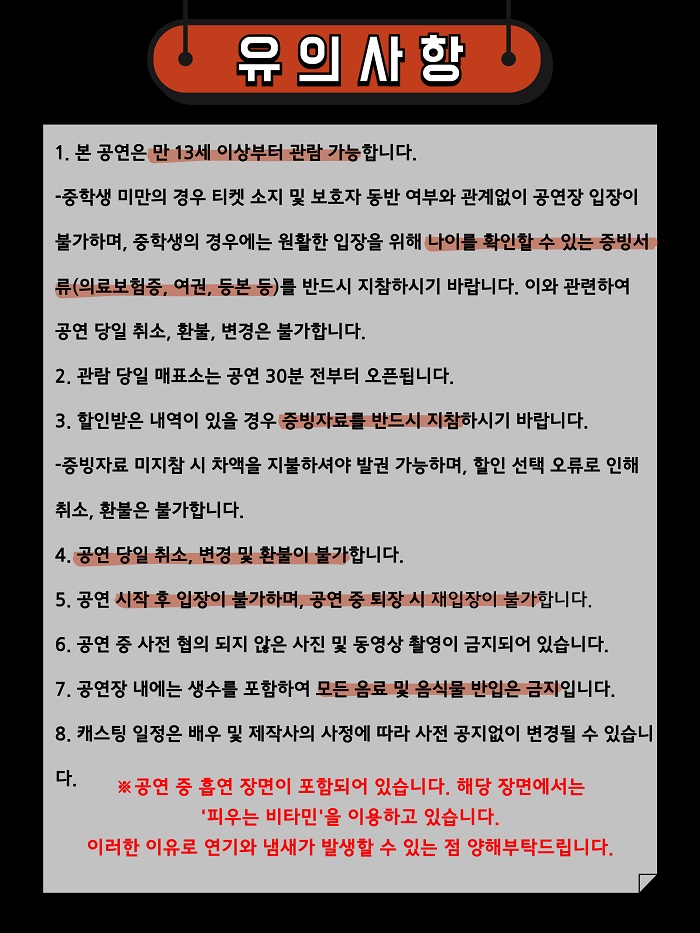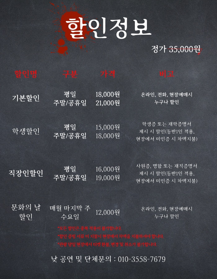 | 공연장르 | 연극(호러), [추가분류] 오픈런 | ||||||||||||||||||||||||||||||||||||||||||||||||||||||