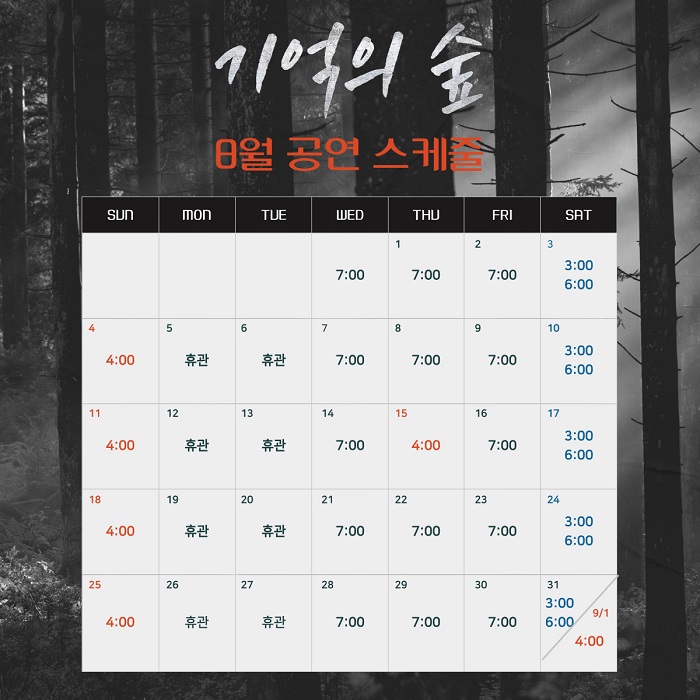 수목금 19:00 / 토,공휴일 15:00 18:00 / 일 16:00 (월화 공연 없음)