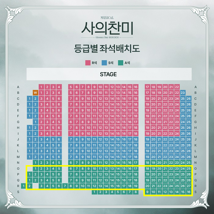 아래 좌석배치도에 노란색으로 표시된 A석 좌석으로 지정됩니다.