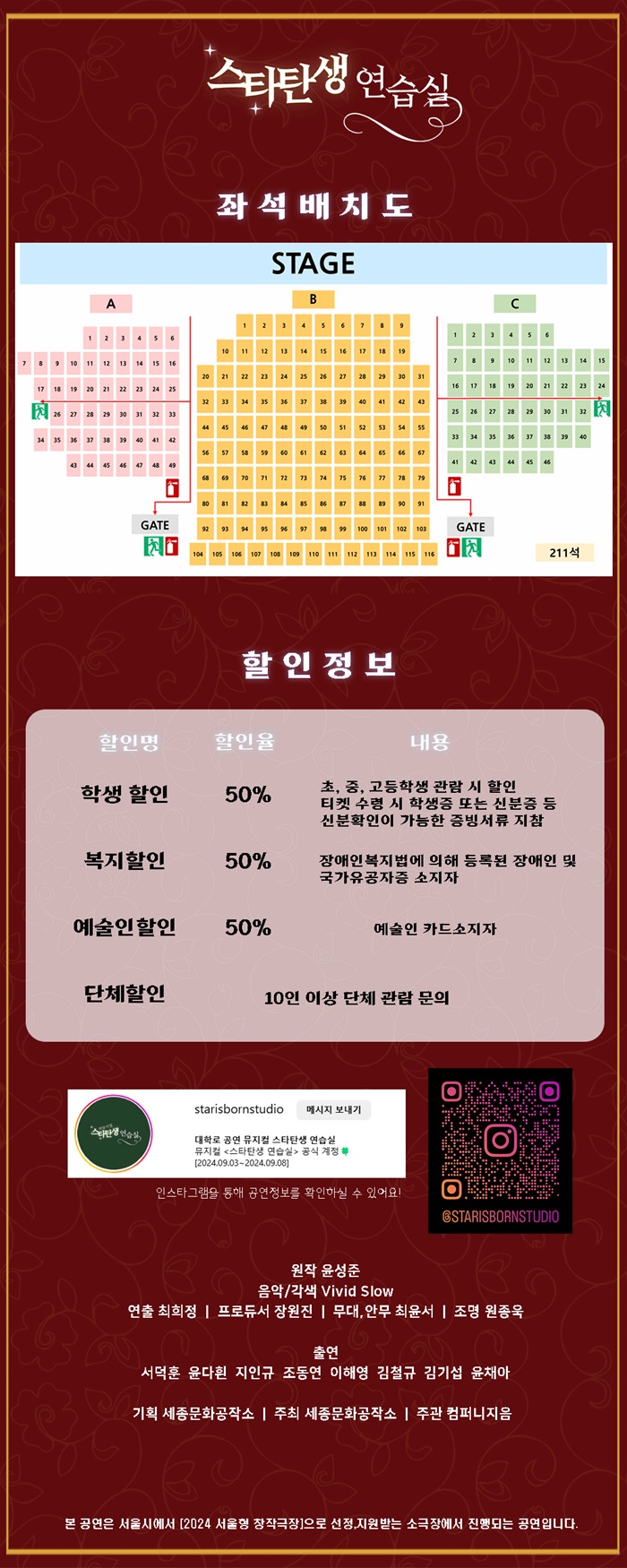 예술인 할인 15,000원 *증빙 자료 지참 (하단 할인 정보 이미지 참조)
