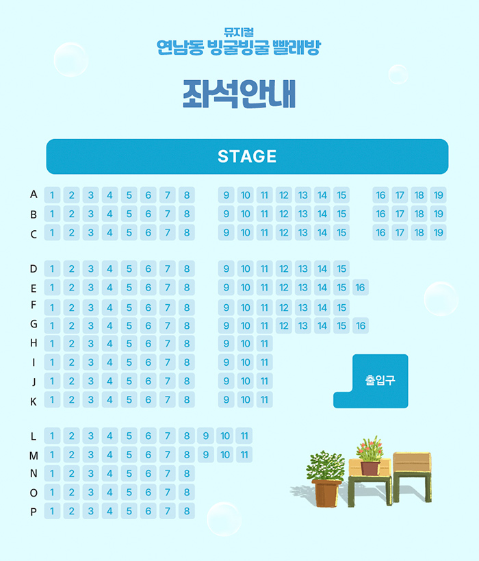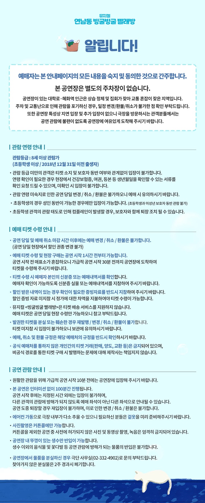 | 공연시간 | 수목금 19:30 / 토 14:00 17:00 / 일 14:00 (월화 공연없음) | ||||||||||||||||||||||||||||||||||||||||||||||||||||||