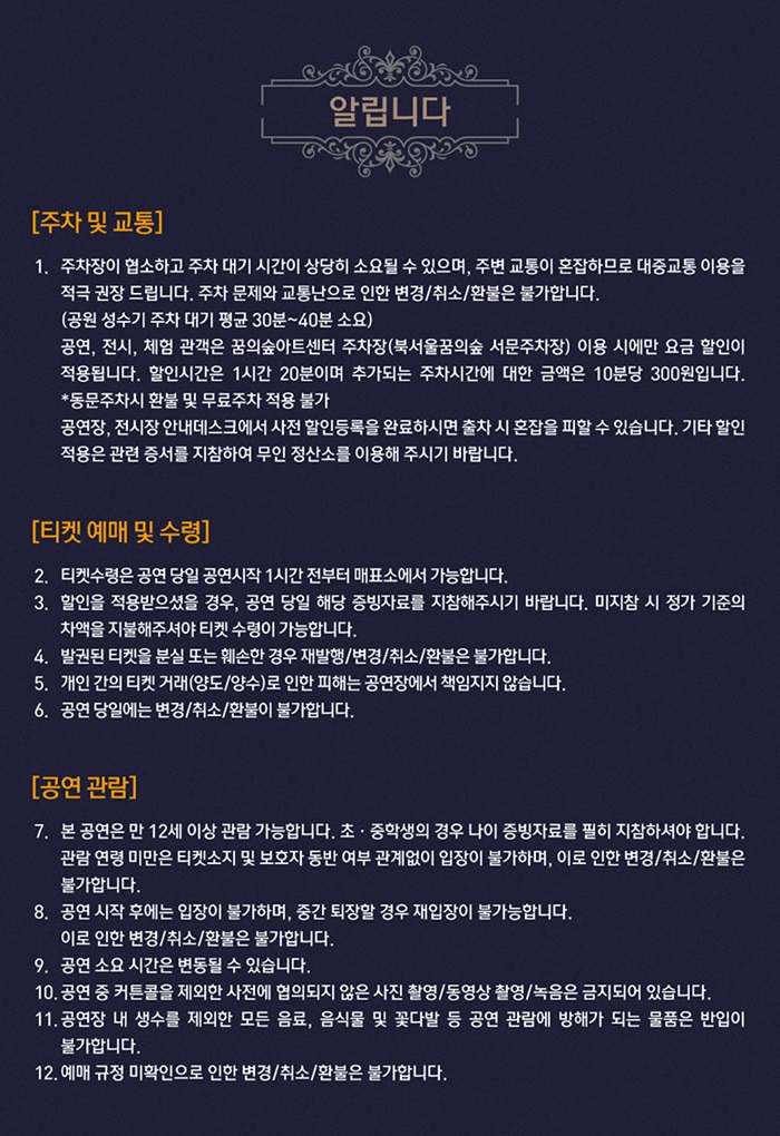 | 공연장소 | 꿈의숲아트센터 퍼포먼스홀 | ||||||||||||||||||||||||||||||||||||||||||||||||||||||