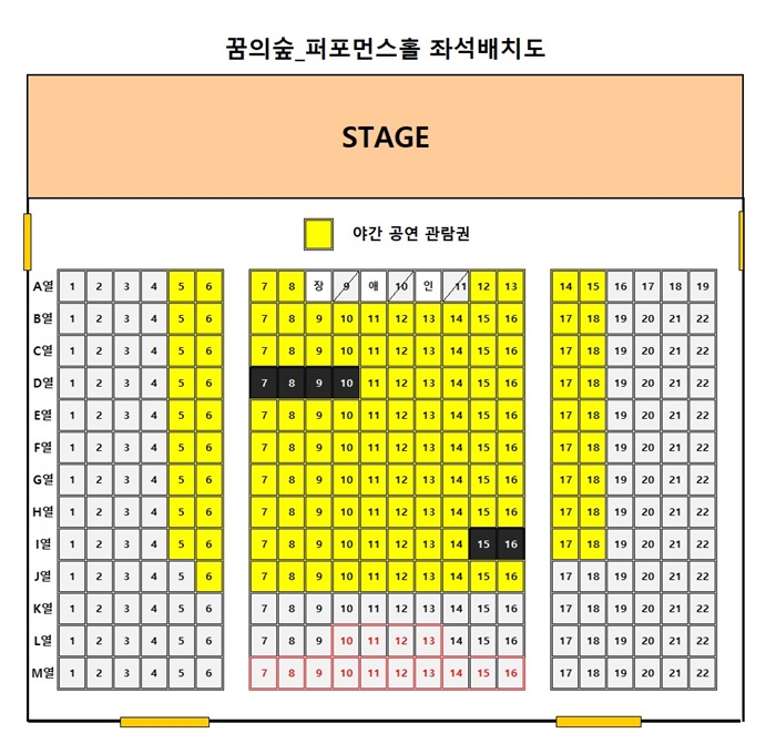 * 관람 당일 공연장 앞 티켓박스(매표소)에서 입장권 수령 시 좌석번호를 확인할 수 있습니다. (노란색 표시 좌석)