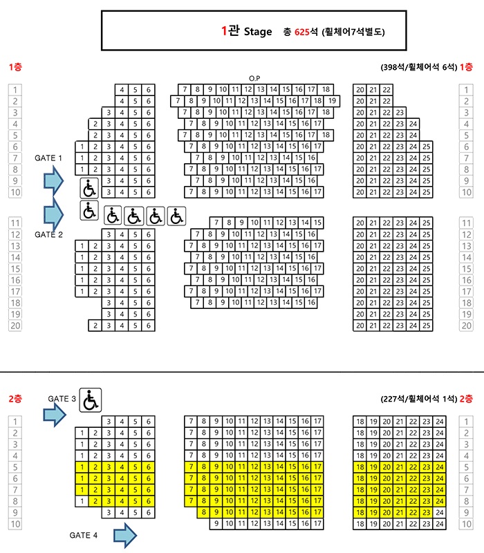 * 관람 당일 공연장 앞 티켓박스(매표소)에서 좌석번호를 확인할 수 있습니다. (노란색 표시 좌석 내에서 배정)