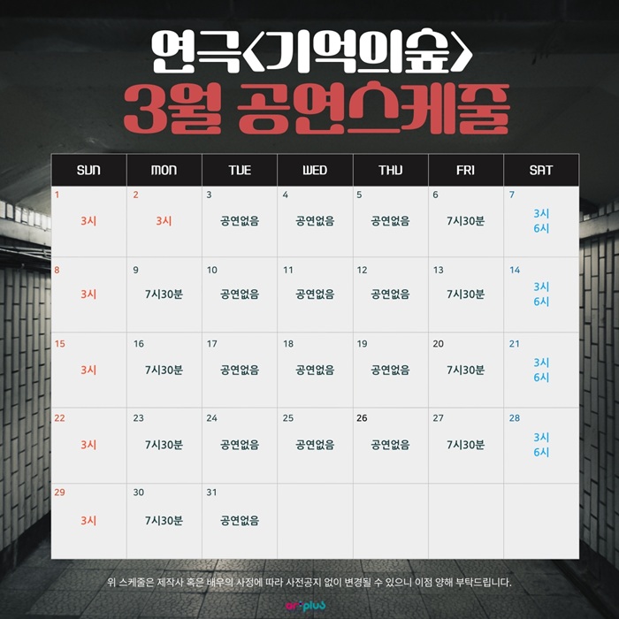 | 공연시간 | 월금 19:30 / 토 15:00 18:00 / 일 15:00 (화수목 공연없음) | ||||||||||||||||||||||||||||||||||||||||||||||||||||||