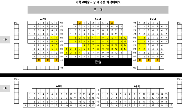 예매하신 순서에 따라 아래 좌석배치도의 노란색으로 표시된 R석 좌석으로 지정됩니다.