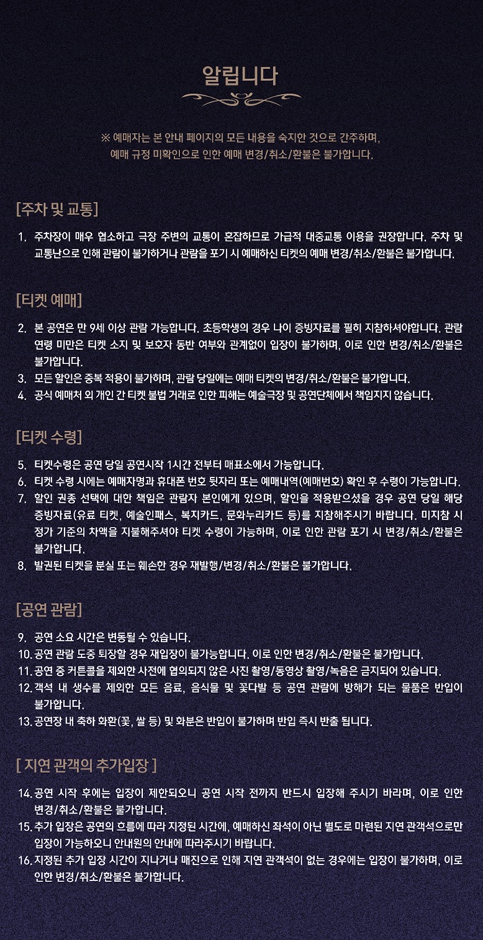 | 공연장소 | 대학로예술극장 대극장 | ||||||||||||||||||||||||||||||||||||||||||||||||||||||