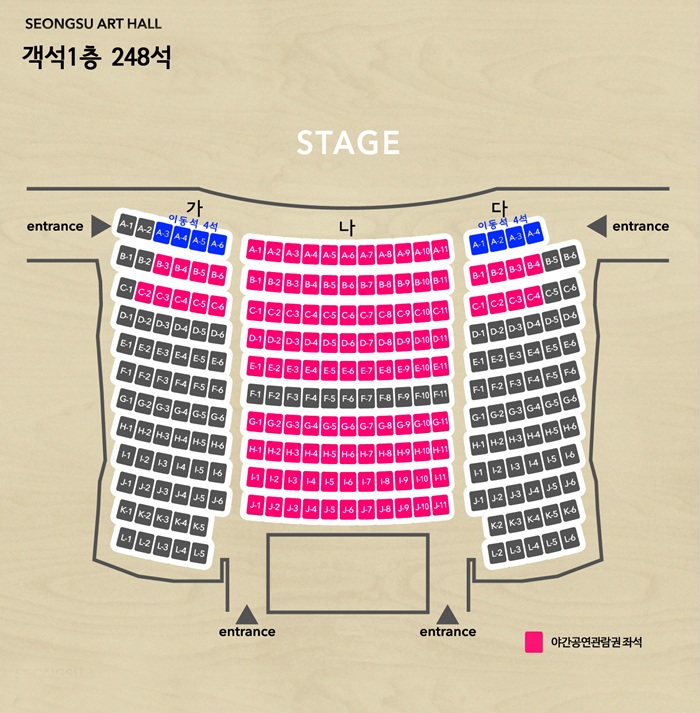 도착하신 순서대로 아래 좌석배치도의 좌석으로 지정됩니다. ( 핑크색 표시 좌석 )