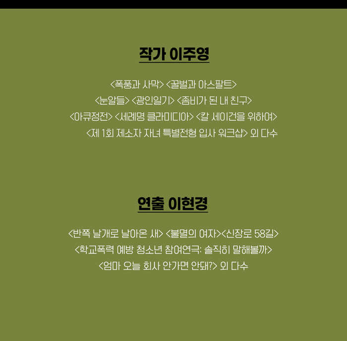 | 공연장르 | 연극(창작), [추가분류] 초연 | ||||||||||||||||||||||||||||||||||||||||||||||||||||||