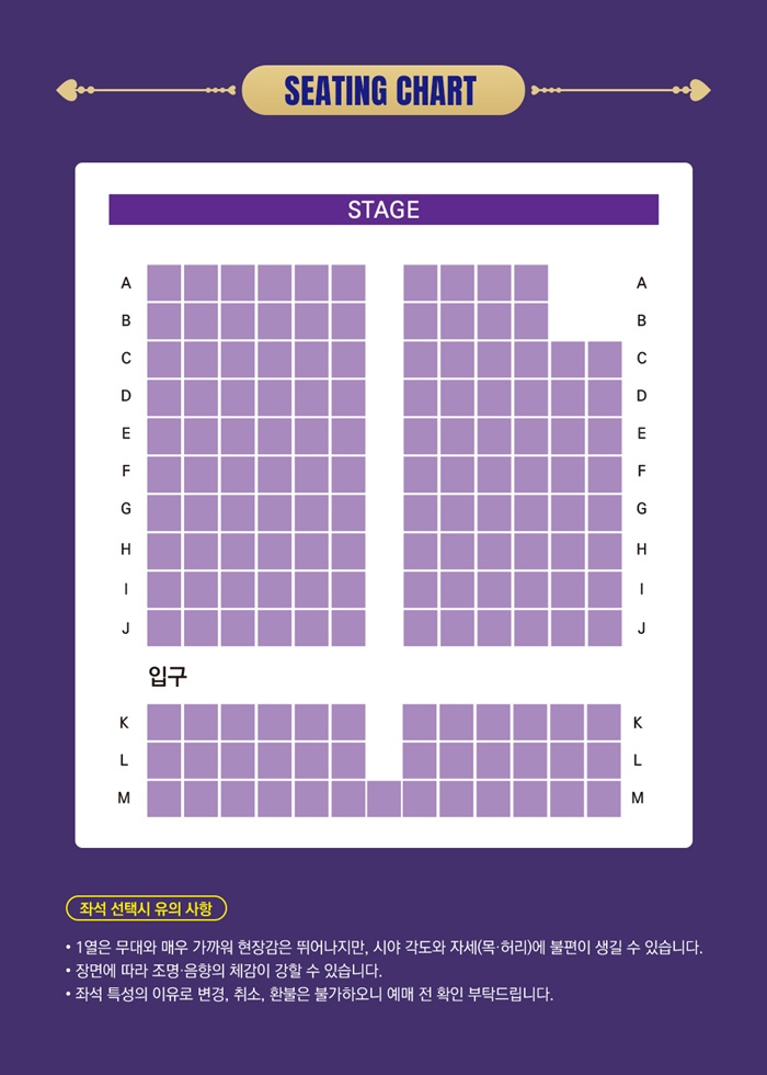 | 공연시간 | 수목금 19:30 / 토 15:00 19:00 / 일 14:00 18:00 / 월화 공연 없음 | ||||||||||||||||||||||||||||||||||||||||||||||||||||||