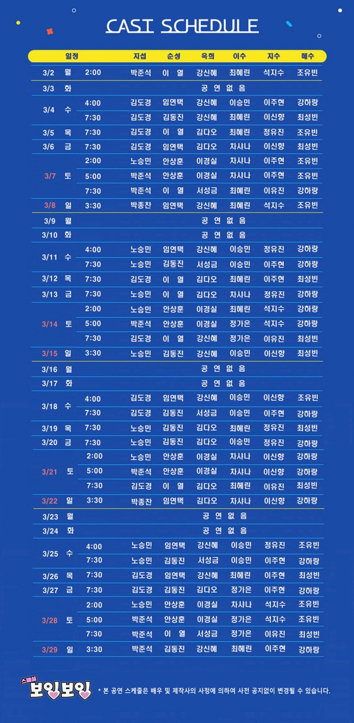 | 공연시간 | 수 16:00 19:30 / 목금 19:30 / 토 14:00 17:00 19:30 / 일 15:30 (월화 공연 없음) | ||||||||||||||||||||||||||||||||||||||||||||||||||||||